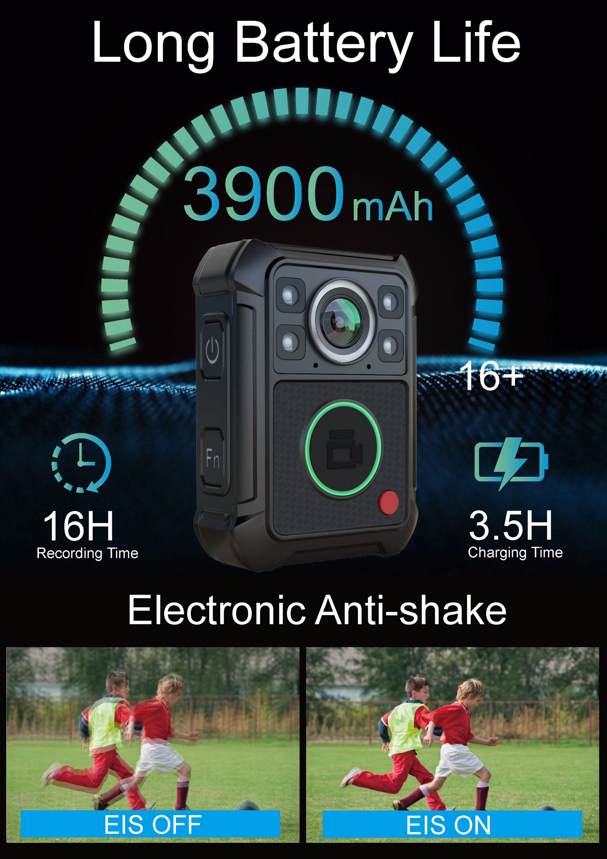 - Battery Life: 16 hours of continuous recording (1080P/30fps/power-saving mode) with a 3900mAh battery. Charging time is 3.5 hours.